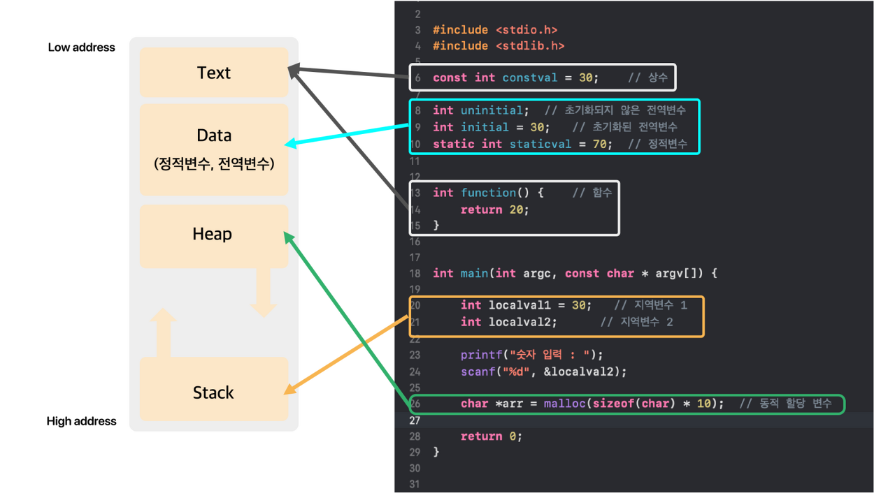 위 이미지처럼 상수, 함수는 Text 영역에, 전역, 정적변수는 Data 영역에, 지역변수들은 Stack 영역에, 동적할당이 되는 변수들은 Heap영역에 위치하게 된다. (참고로 malloc 함수는 런타임(실행중)에 메모리를 동적으로 할당할 수 있는 함수이다.)