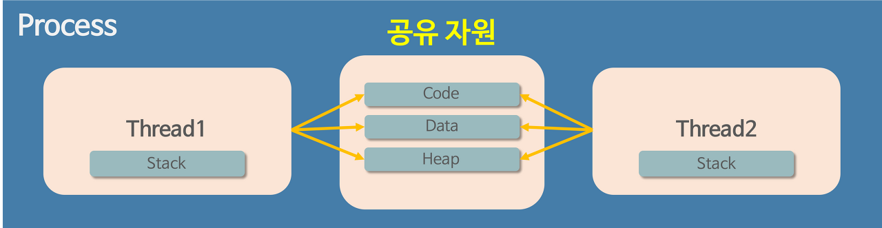 이와 다르게 스레드는 메모리를 서로 공유할 수 있다고 언급했었다. 이에 대해 더 자세히 설명하자면, 프로세스가 할당받은 메모리 영역 내에서 Stack 형식으로 할당된 메모리 영역은 따로 할당받고, 나머지 Code/Data/Heap 형식으로 할당된 메모리 영역을 공유한다. 따라서 각각의 스레드는 별도의 스택을 가지고 있지만 힙 메모리는 서로 읽고 쓸 수 있게 된다.