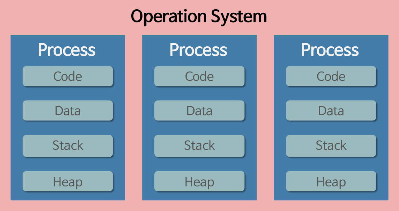 위에서 프로세스가 메모리에 올라갈 때 운영체제로부터 시스템 자원을 할당받는다고 언급했었다. 이때 운영체제는 프로세스마다 각각 독립된 메모리 영역을, Code/Data/Stack/Heap의 형식으로 할당해 준다. 각각 독립된 메모리 영역을 할당해 주기 때문에 프로세스는 다른 프로세스의 변수나 자료에 접근할 수 없다.