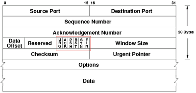위 그림은 TCP Header를 나타낸다. TCP Header에는 Code Bit(Flag Bit)이라는 부분이 존재한다. 이 부분은 총 6Bit로 이루어져 있으며 각각 한 Bit가 의미를 가지고 있다. URG-ACK-PSH-RST-SYN-FIN 순서로 되어 있으며 해당 위치의 Bit가 1이면 해당 패킷이 어떠한 내용을 담고 있는 패킷인지를 나타낸다. SYN Packet이면 Code Bit가 000010이 되는 것이고, ACK Packet이면 010000이 되는것이다.