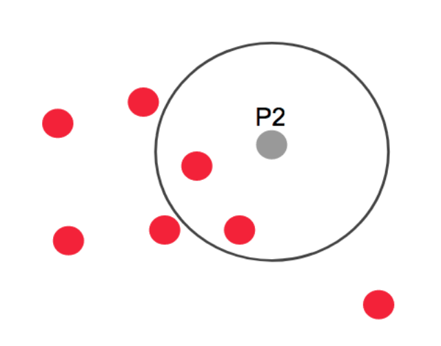 다음으로 P2의 경우 점 P2를 중심으로 epsilon 반경내의 데이터가 3개 이기 때문에, min points = 4 에 미치지 못하므로 core point는 되지 못하지만, 이웃 데이터 중에 앞서 core point인 P를 가지고 있으므로 boder point (경계점)가 된다. 경계 포인트는 cluster의 외곽을 형성한다.