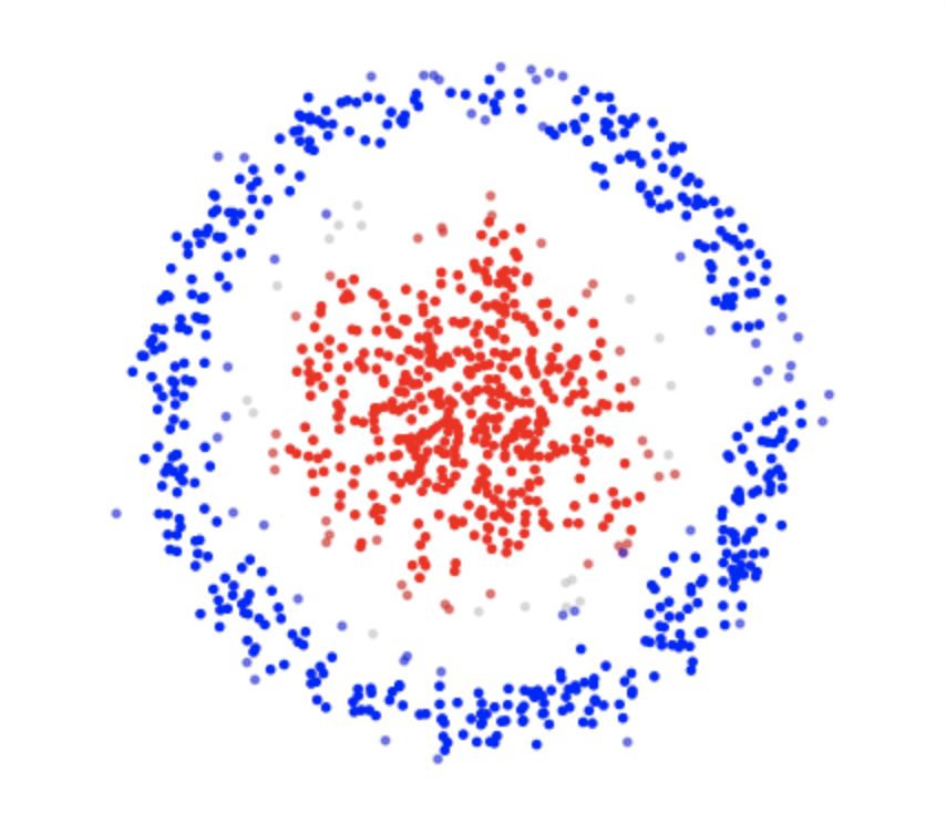 DBSCAN은 간단하고 직관적인 알고리즘으로 돼있음에도 데이터 분포가 기하학적으로 복잡한 데이터에도 효과적인 clustering이 가능하다. 아래와 같이 내부의 원 모양과 외부의 원 모양 형태의 분포를 가진 데이터를 clustering 한다고 가정할 때 K-means, Means-Shift, GMM으로는 효과적인 군집화를 수행하기가 어렵다. DBSCAN은 특정 공간 내에 데이터 밀도 차이를 기반 알고리즘으로 하고 있어 복잡한 기하학적 분포도를 가진 데이터에 대해서도 clustering을 잘 수행한다.